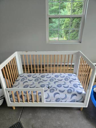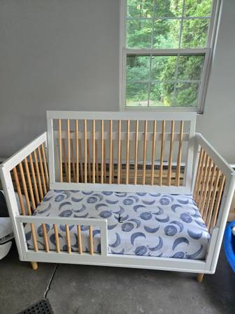 White crib with mattress and sheet. Has full size side and option for low railing. FREE.