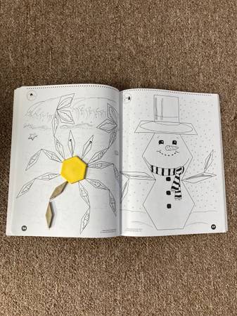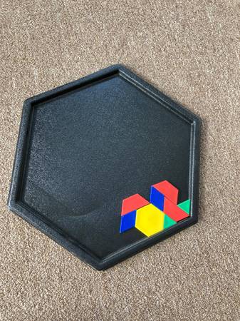 A set of plastic pattern blocks and tray to place them in for creating designs. Also includes a book of pictures to use the pattern blocks on. Like new