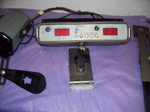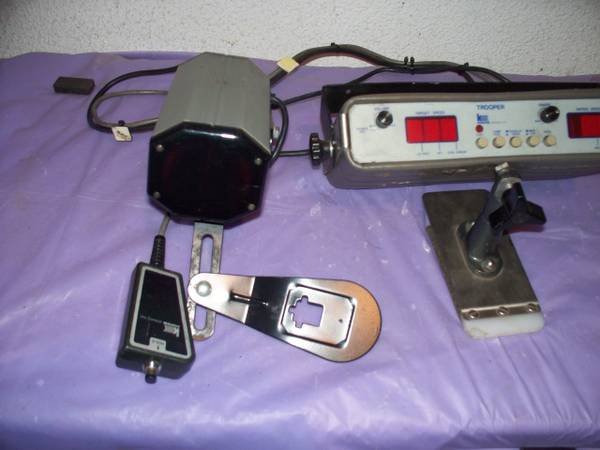This is a complete Police speed radar system. I have tested this, and it is working; however, I do not know how accrete it is, but I am pretty sure that it is a good working unit. It also has all the parts to mount it. This also comes with a test tuning fork. This has the mounting for a car window. It is 12 volts It is called a Trooper. It also has a hold button.