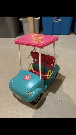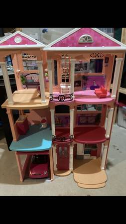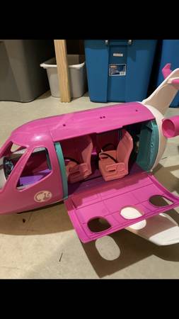 Barbie house, plane, car, golf cart, cruise ship, and dolls with accessories. Text: George (616)309-3ninetwofive