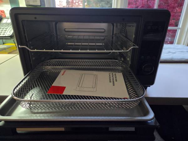 New Toshiba toaster oven. Never been used. Comes with rack, broiler pan and mesh basket. $50.00.