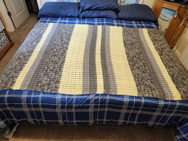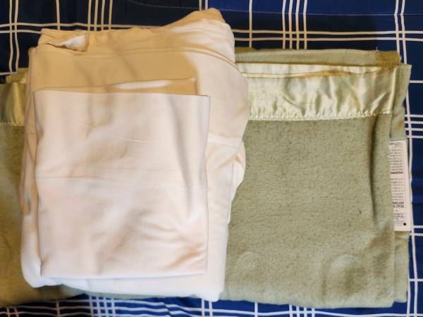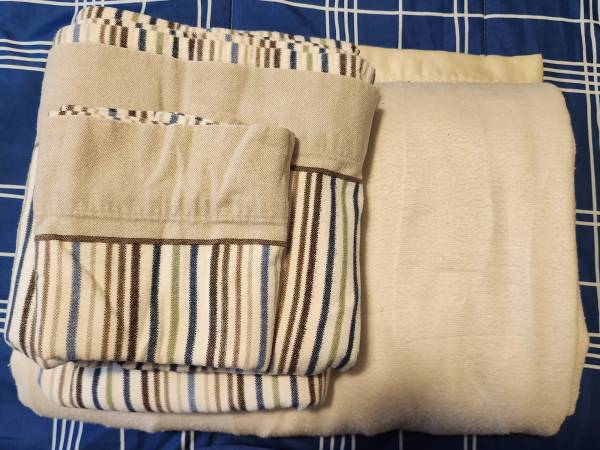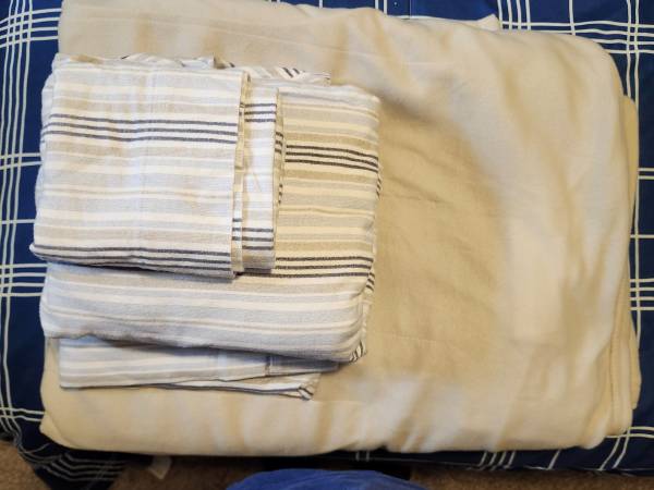 Each set includes gently used fitted and flat flannel sheets with matching pillow case plus an electric blanket. Also available 50 x 75 gray and yellow hand crocheted aphgan for $10. Located near...