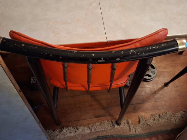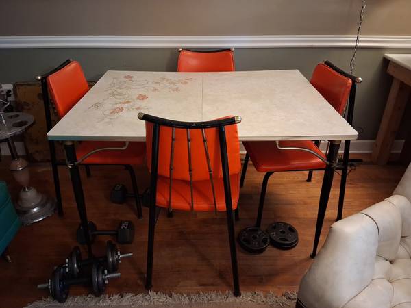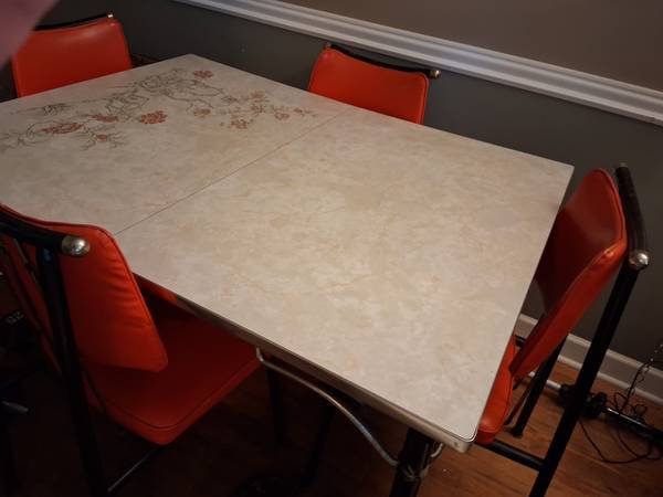 Interesting mid century set. B. Brody of Chicago 1950's or 1960's. All 6 chair still have their original glides 5' long and 3' wide including 12" leaf. Sturdy. Metal parts have nicks in black paint....