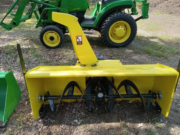 This 2032r comes with bucket with equipped Reese hitch and chain hooks on bucket. A set forks a front snowblower back wheels are loaded and have 2 sets of wheel weights each tire weight block for traction there are also 2.5 inch wheel spacers on both back tires.