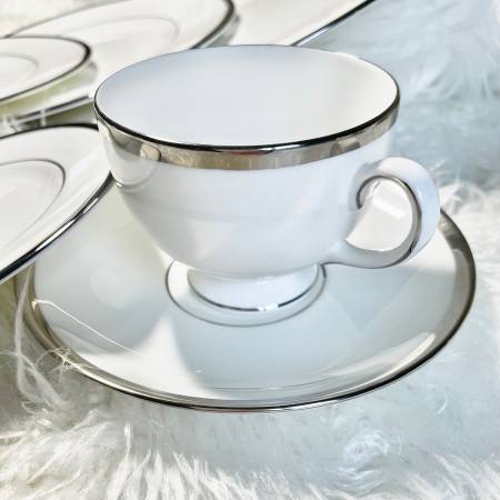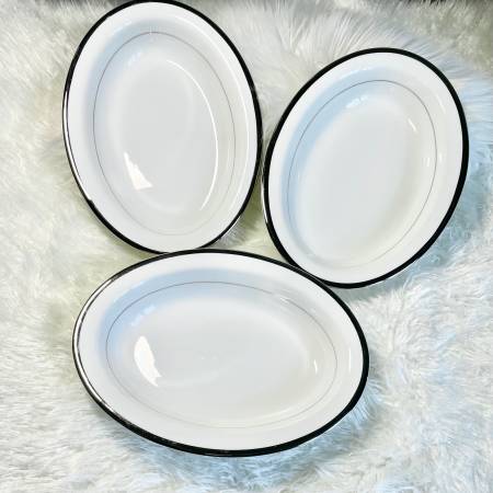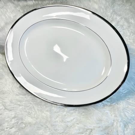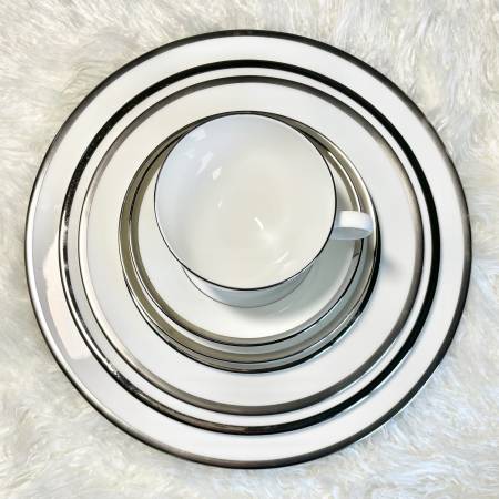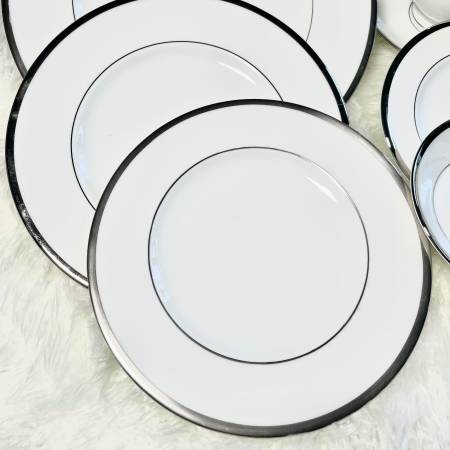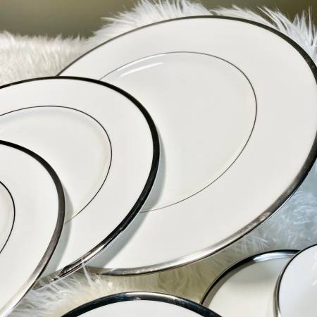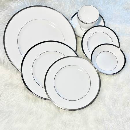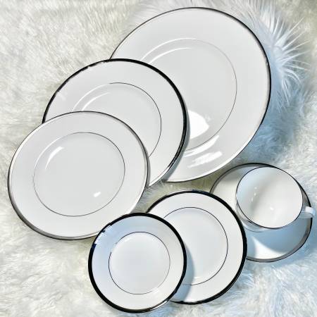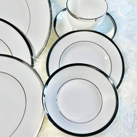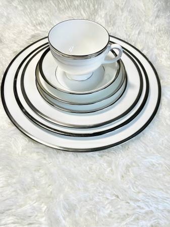 $250 Timeless Gorgeous (61piece total) 8 place setting dining set with 3 large serving dishes (2 oval 1 round) and 3 smaller deeper oval serving dishes. Stark white with sterling silver color. No cracks or chips. Beautiful. Excellent condition.