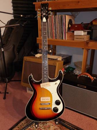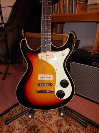 For sale, Eastwood Baritone guitar, excellent condition, Sunburst finished copy of a Mosrite guitar, which was popularized by the Ventures, a surf group in the 60's. This guitar is very well made, it plays like butter, and is built for the long-haul. I upgraded it with American CTS pots, Switchcraft jack, and a premium custom-wound set of P90s. I also made a much nicer looking pickguard (mint green), as well as added some nice laboratory oversize knobs. It is currently setup with Pyramid Pure Nickel strings, solid nickel are the only way to go with P90's to my ears. Here are the specs and more info on this guitar: https://eastwoodguitars.com/products/sidejack-baritone?variant=32948182319189
