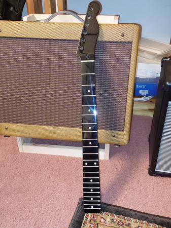 "vintage" replacement neck with the guitar. This is a vintage 21-fret maple neck, I believe it is a Japanese-made neck, and it has been painted gloss piano-black by a guitar shop. This is a one of a kind guitar which will last a lifetime, and the replacement neck which i am including is a very unique one of a kind black lacquered neck, which can beused as a back up neck......or you just may want to put this cool looking neck on this guitar for unique guitar look. The body of the tele received 6 very thin coats of real Nitro lacquer, from Ohio Nitro Shop. Three color coats, and three clear coats, for a total of perhaps .002" or less thickness of lacquer. I have NOT rubbed this lacquer out, to keep it looking like a 1950 telecaster. Nitro lacquer will continue to dry and stretch until you can see through it.......But this hyper-thin paint allows you to hear the wood in this guitar.......You will not be disapponted with it's sound. It has spent all of it's time in my studio (6 years), it has never been out of my home. Very nice example of a 1950 Telecaster clone, in looks and in sound.