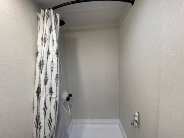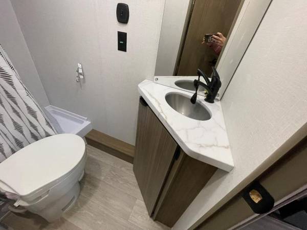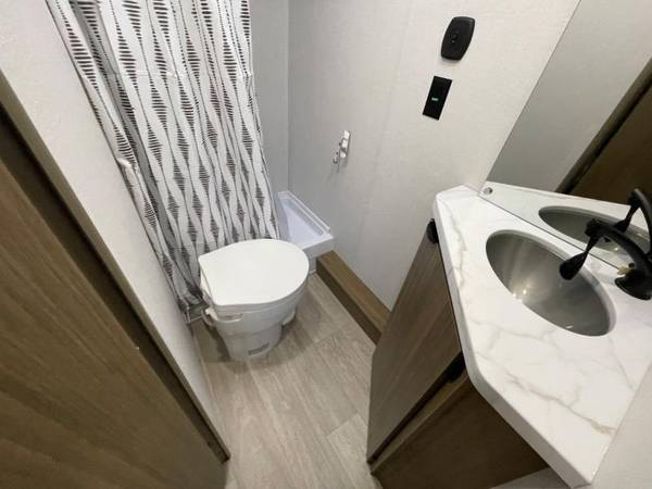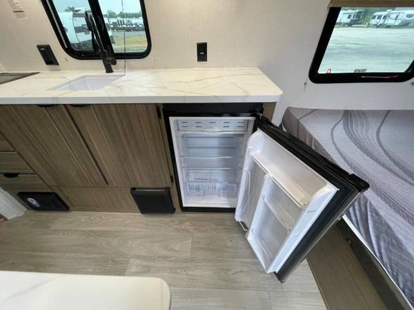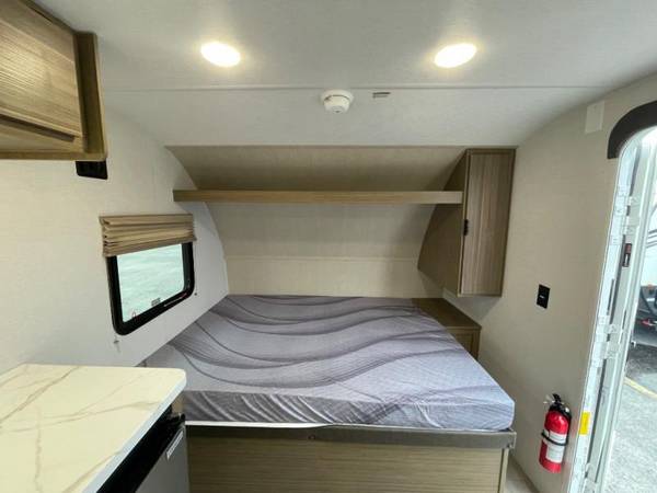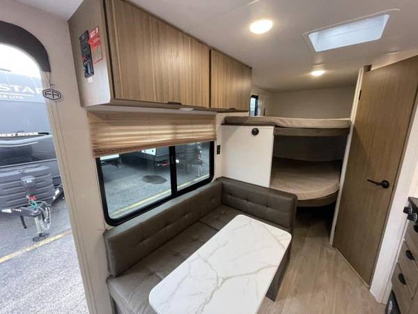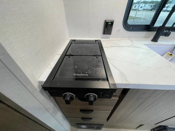 The double-size bunks with storage will be a big selling point in this travel trailer! While your guests take the bunks, you can have the front queen bed all to yourselves, and there is a wardrobe to keep your things organized. A two burner cooktop and microwave will let you make meals each day, and you can dine at the open lounge with a table.