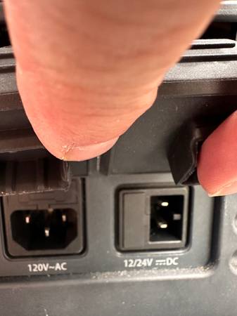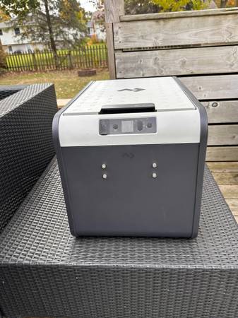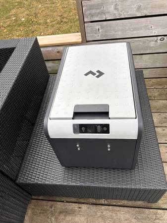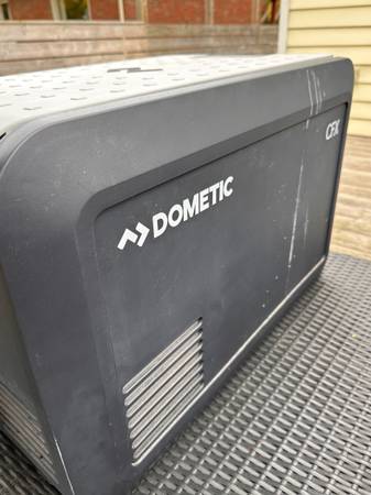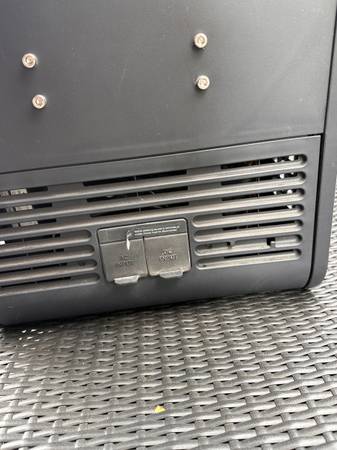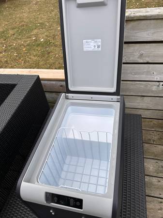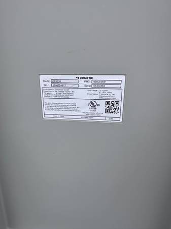 Four-year old fridge used in van. Still working but we replaced for upright. Handles have been removed because we had it in cabinet/bench. AC or 12volt powered. Only AC cord available. Clean.
