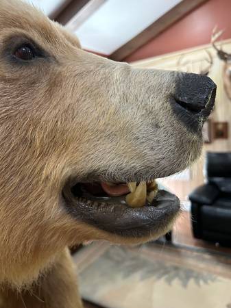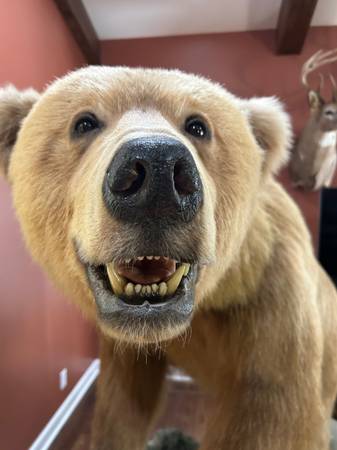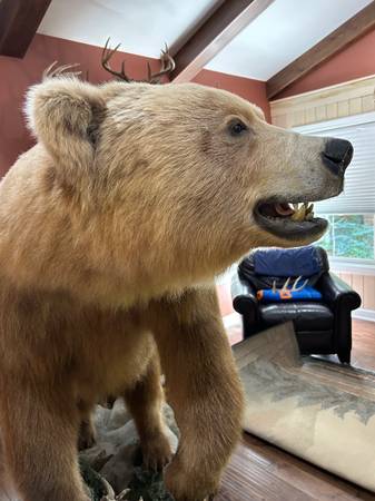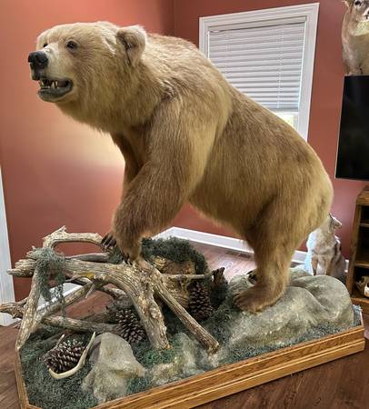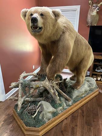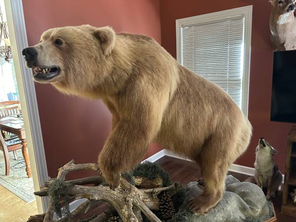 Full Beautiful Brown Bear. Mounted by renown G. R. Taxidermist, Naber Taxidermy. Beautiful nature setting base on wheels. Just like new. Very well taken care of. $3000. Cash. All necessary papers...
