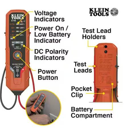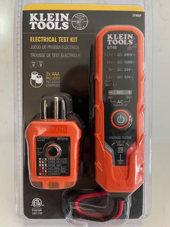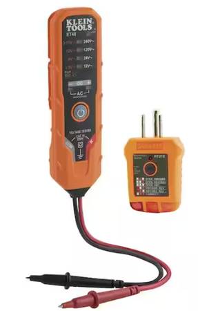 ET40VP Electrical Test Kit from Klein Tools is excellent for checking, verifying or troubleshooting common residential electrical wiring. The ET40 is an AC/DC Electrical Voltage Tester with AC voltage at 12V, 24V, 120V and 240V and DC voltage at 1.5V, 9V, 12V, and 17 to 24V covering the most commonly used residential voltages. RT210 Receptacle Tester detects the most common wiring problems in standard and GFCI receptacles: open ground, reverse polarity, open hot, open neutral, hot/ground reversed.