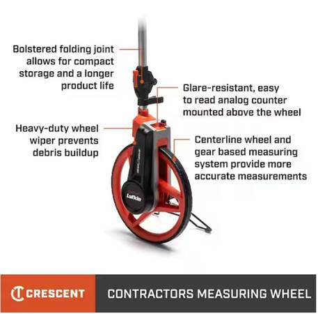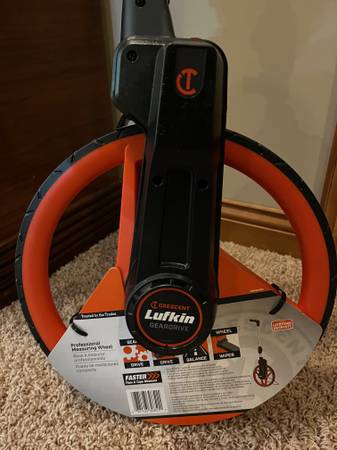 Here is a Brand New with Tags, never been used LUFKIN/Crescent Gear Drive 12.5" Dia. Wheel Contractor Measuring Wheel with folding handle and kick stand.