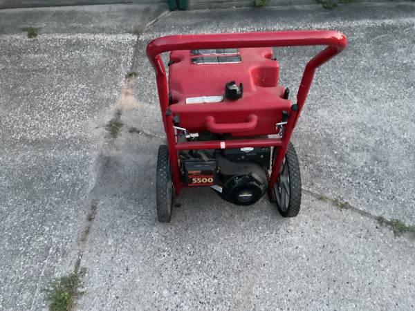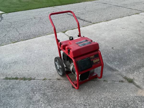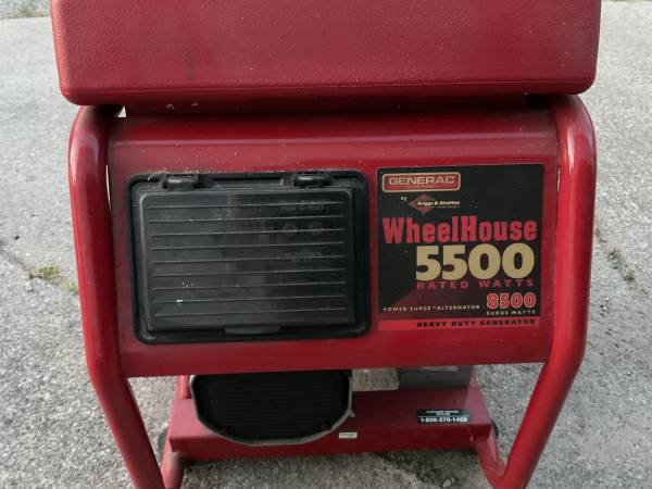 5500-watt running/8500-watt starting generator powered by a 10 HP Briggs & Stratton engine. Has a 5-gallon fuel tank with 12 hours of run time at half load, 120/240 volt output, and 46.2/23.1 amps. It features low oil protection, a recoil start, weights about 176lbs with 14-inch wheels for mobility. Hardly used in excellent condition. Call/text show contact info