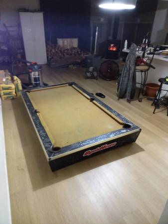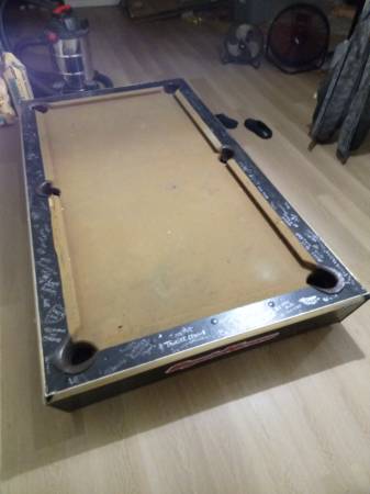 FREE Older Pool Table. Solid table! Would look great with a nice paint job for the sides but perfect to use as is!!!! Comes with the legs ( stands ), balls, rack but no que sticks. Again, use as is for some weekend fun or also a great project for the DIY!!